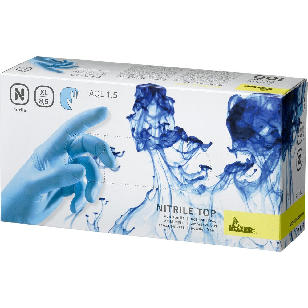 Guanti monouso NITRILE TOP, 100% nitrile. Ambidestri, senza polvere, clorinati, con finitura esterna granitiforme. Lo spessore di 0,12 mm conferisce al guanto sensibilità e destrezza, e l’ottima elasticità lo rende estremamente confortevole. Sono, per caratteristiche, l’alternativa più simile al lattice naturale, concentrando in un unico prodotto, proprietà di resistenza chimica (leggera), flessibilità e adattabilità anche alle mani più intolleranti. Sono idonei anche per contatto alimentare e per uso medicale. Prima dell’utilizzo leggere attentamente la nota informativa del prodotto stampata sul retro della confezione.