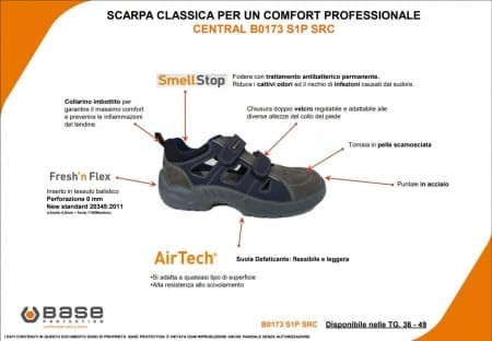 Sandali antinfortunistici B0173 CENTRAL , S1P SRC. La migliore combinazione qualità/prezzo, per una calzatura intelligente capace di rispondere a tutte le esigenze. La sua suola infatti è dotata di una tecnologia che permette di ridurne lo spessore duro e compatto a livelli mai visti prima, per ottenere così una maggiore elasticità ed effetto ammortizzante.