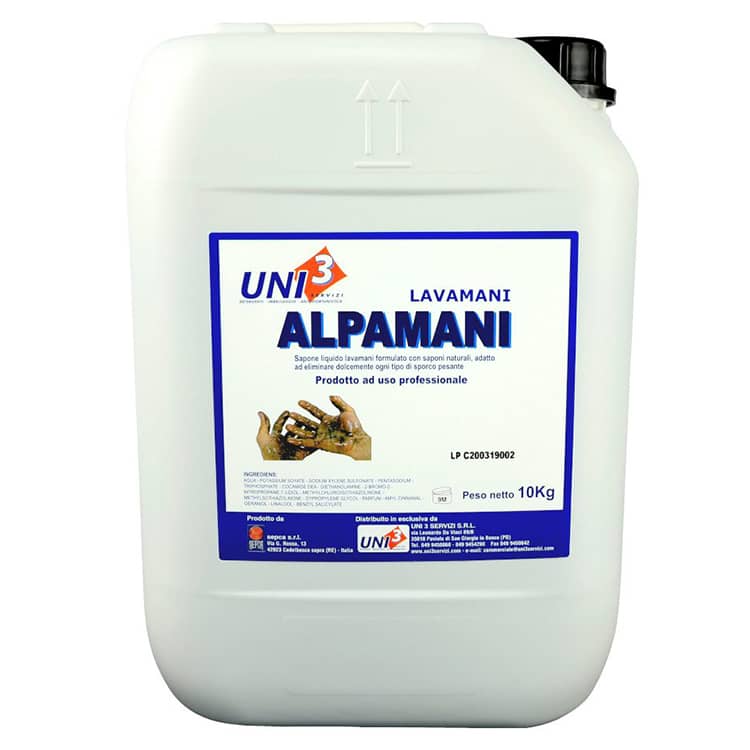 Sapone liquido ALPAMANI , lavamani professionale per sporchi pesanti. Grazie alla sua formulazione con saponi naturali è in grado di eliminare dolcemente anche gli sporchi pesanti. Per la massima efficienza prelevare una dose di prodotto a mani asciutte, frizionare fino alla completa emulsione dello sporco e risciacquare con acqua. Elimina facilmente e delicatamente anche gli sporchi più resistenti. PH7,5.